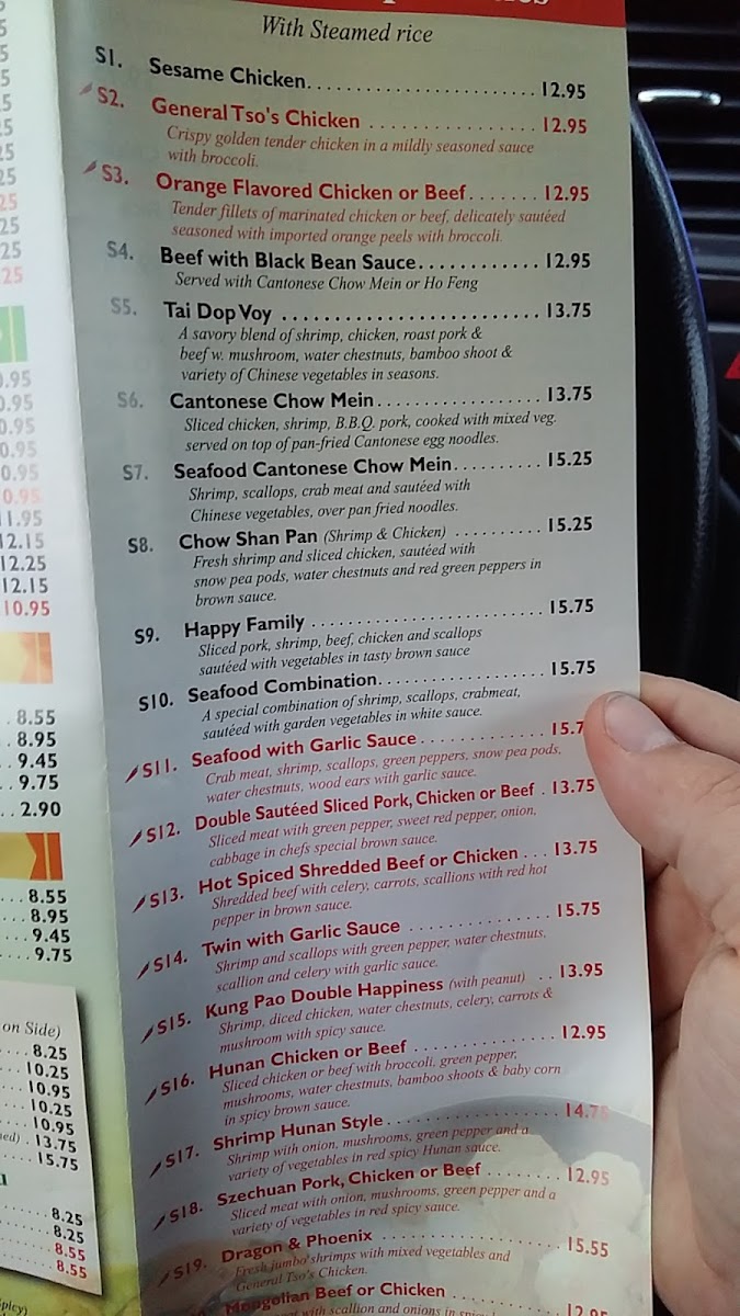 Contains nuts. Served with white rice or chicken fried rice and soda or egg roll.
